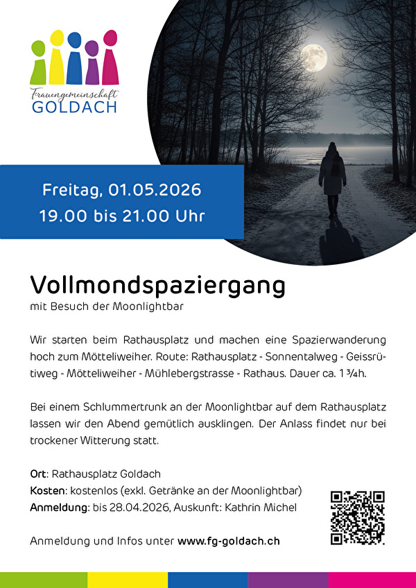 Wir starten beim Rathausplatz und machen eine Spazierwanderung hoch zum Mötteliweiher. Route: Rathausplatz - Sonnentalweg - Geissrütiweg (neu) - Mötteliweiher - Mühlebergstrasse - Rathaus. Dauer ca. 1 3/4h. Bei einem Schlummertrunk an der Moonlightbar auf dem Rathausplatz lassen wir den Abend gemütlich ausklingen. Der Anlass findet nur bei trockener Witterung statt.
